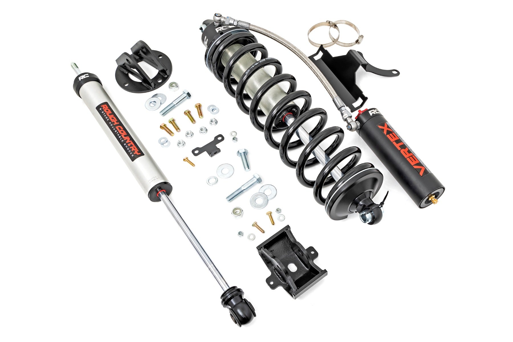 Durable Components. Rough Country’s 4.5" Coilover Conversion Kit features top-mounted reservoir brackets and coil-over mounts constructed from 1/4-inch steel. Utilizing this conversion kit you're removing the factory independent coil shock and coil set-up and replacing it with a massive 2.5in piston, nitrogen-charged, 8-stage adjustable Vertex Coilover. Rough Country’s Vertex Coilovers feature a monotube design with an external reservoir for increased oil capacity and damping sensitivity. When it comes to investing in a high-end kit, you’ll be pleased to find that Rough Country’s 2.5in piston design is beefier and offers an impressive 56% greater fluid capacity than the average reservoir shock. Each kit is paired with a V2 monotube shock that provides optimal damping control.
